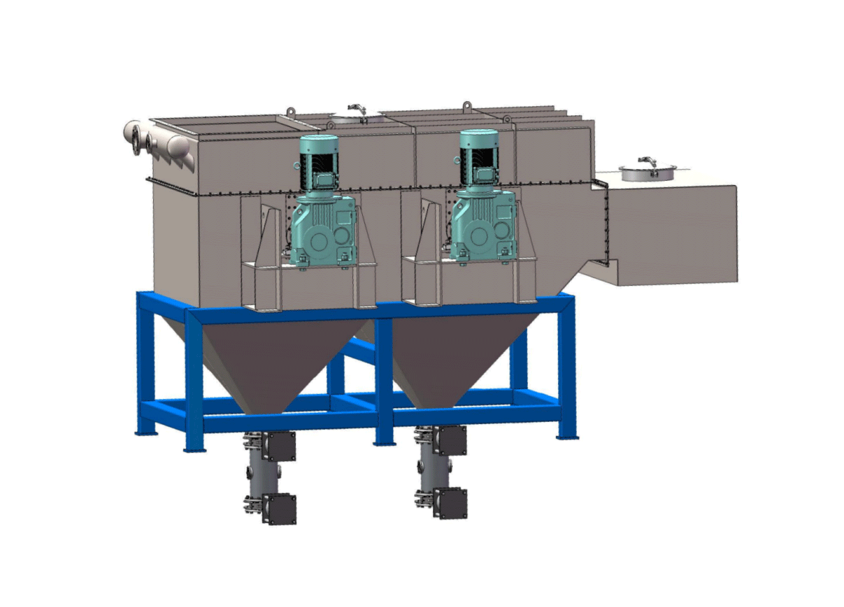 轉(zhuǎn)鼓在驅(qū)動裝置下進行旋轉(zhuǎn),同時泵入大量的洗滌水,料片從進料口進入后,在洗鼓推動水流的作用下不斷進行翻滾和前進,水流把料片上的灰塵雜質(zhì)清洗干凈,比重較大的雜質(zhì),例如鐵塊、不銹鋼零件、石塊、秸稈種子等落入下方的重物收集槽內(nèi)定時排放,洗干凈的料片隨著水流落到后續(xù)的脫水設(shè)備上進行固液分離工序。